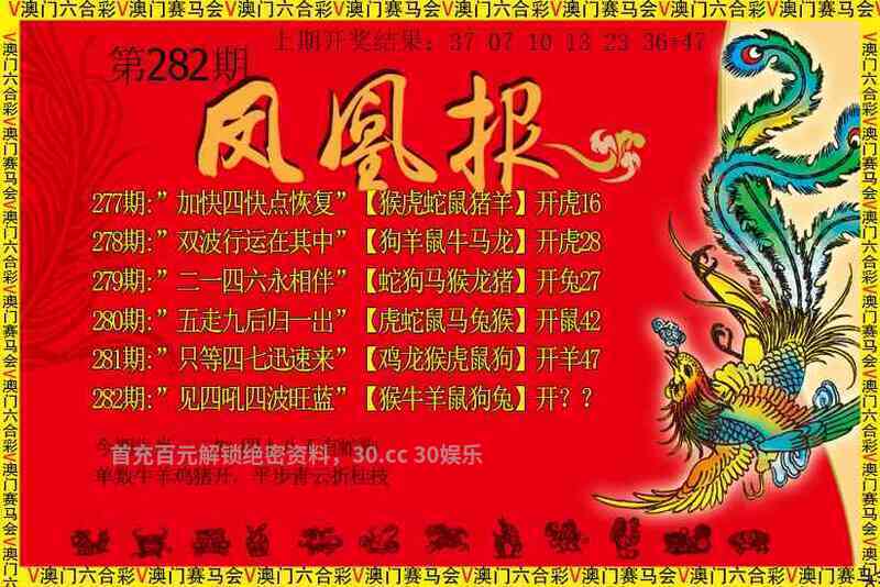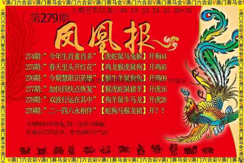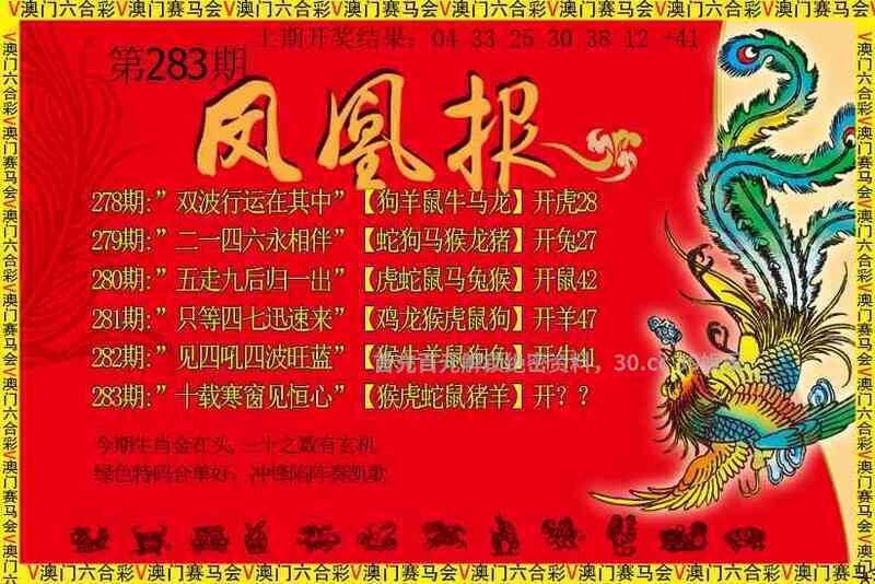 283期:【凤凰卜卦】 玄机诗:天赐王恩蛇马舞,龙猴莫问出家人,顺藤摸瓜蛇缠马,分合天下本一家 凤凰解析:本一家解出家禽牛羊鸡猪狗马 玄机六肖:龙猪羊狗马鸡 |